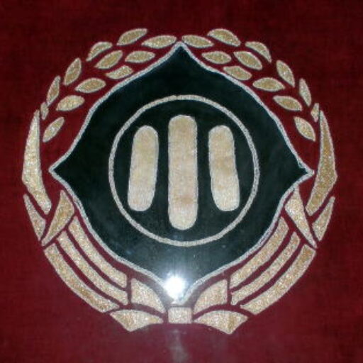 これは稲穂がたわわに実り,黄金の波を打つ日野の自然を表し,常に実り豊かな子どもたち育成を願っての校章です。特に稲穂を大切にする意味をこめてリボンで結んであります。そして湧き出ずる泉の水の,四方への広がりを青で示し,小学校が日野地区の中央にあるので,中に小の文字を配しております。(昭和37年4月制定)